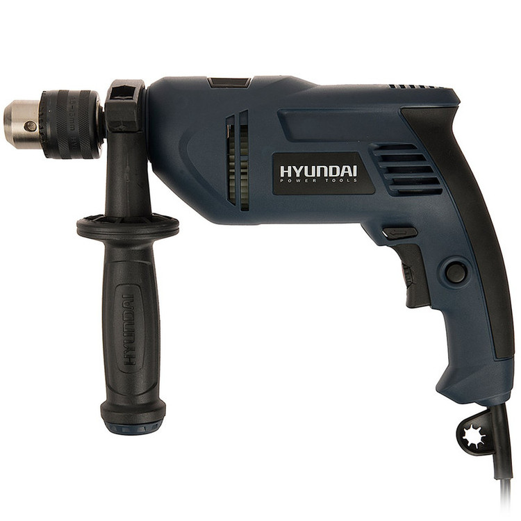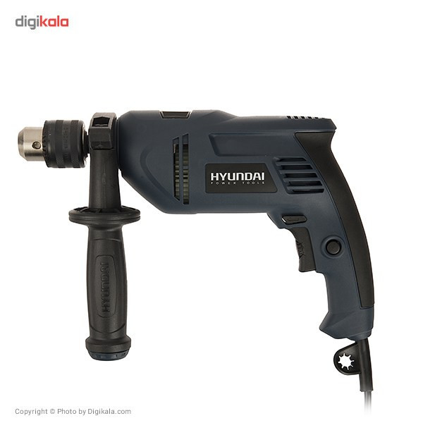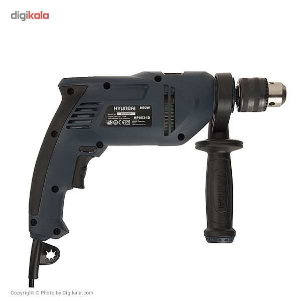 اگر قصد تهیهی یک دریل چکشی مناسب با قدرتی قابل قبول دارید، میتوانید از دستگاه فوق استفاده کنید. این دریل از توانی برابر 850 وات برخوردار است و از قابلیت کنترل سرعت گردش سود میبرد. میزان سرعت گردش این دستگاه توسط کلیدی چرخشی که روی شستی قرار دارد تنظیم میشود. بازهی سرعت چرخش این دستگاه 2700-0 دور بر دقیقه است. از دیگر مزایای این دستگاه میتوان به قابلیت چرخش ساعتگرد و پادساعتگرد آن اشاره کرد. سه نظام این دریل چکشی از نوع 13 میلیمتری آچارخور بوده و حداکثر قطر سوراخکاری آن در چوب، فلز و مصالح به ترتیب برابر 25، 13 و 13 میلیمتر است. با کمک این دستگاه میتوانید با دقت و تسلط بیشتری به کار خود بپردازید که این ویژگی به دلیل وجود دستهی کمکی و قفل سوییچ این دریل حاصل شده است. این دسته قابل تنظیم بوده و از قابلیت چرخش 360 درجه سود میبرد. دستگاه فوق با نام (HP853-ID) شناخته میشود و یکی از تولیدات شرکت «هیوندای» (Hyundai) است.