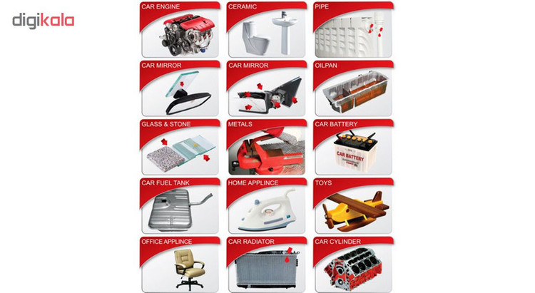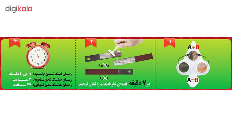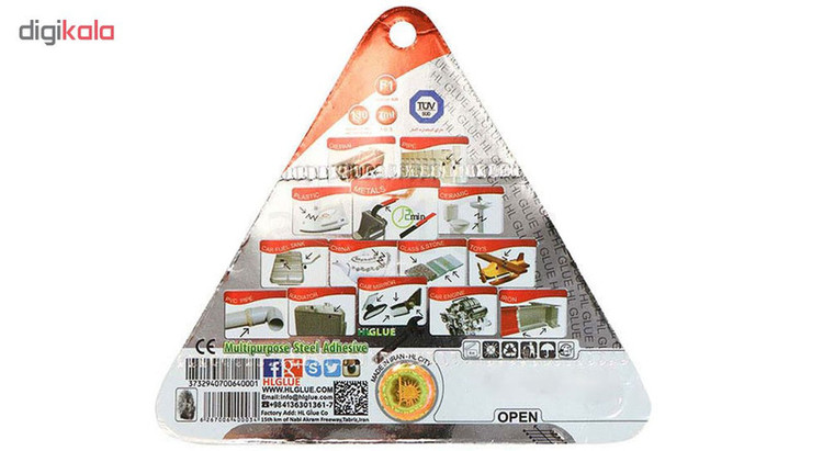 چسب فولاد کاسه ای 7 میلی لیتری همه کاره هل در عرض 2 الی 10 دقیقه خشک شده و همچون آهن قابل تراش و رزوه خوری می شود. برای چسباندن و ترمیم انواع مواد و جلوگیری از نشتی مایعات مناسب می باشد. با تحمل حرارتی 130 درجه سانتی گراد و شوک حرارتی 210 درجه سانتی گراد. قدرت چسب: 60 کیلوگرم بر 1 سانتی مترمربع تحمل کشش دائمی و 300 کیلوگرم بر سانتی مترمربع تحمل کششی موقت این چسب می باشد. طریقه مصرف: این محصول به صورت 7 میلی لیتری کاسه ای دوقلو بسته بندی شده است. محتویات بسته بندی شامل: جزء مشکی چسب (رزین) A و جزء قرمز چسب (هاردنر یا خشک کن) B، کاردک برای برداشتن و مخلوط کردن محتویات کاسه ها، سمباده و پارچه داخل جعبه برای تمیز کردن سطح مورد نظر می باشد. 1) ابتدا محل مورد نظر را سمباده زده, تمیز و خشک نمایید 2) دو جزء چسب را بطور مساوی با کاردک داخل جعبه 3 الی 6 دور کاملاً مخلوط کرده و سریعاً به محل مورد نظر مالیده و از تکان دادن قطعات حداقل تا هفت دقیقه خودداری نمایید. اگرموفق نشدید بخاطر این دلایل است: 1)هیچ چسبی پلاستیک پلی اتیلن(PE) و پروپیلن (PP) را نمی چسباند. 2)چسب فولاد هل ورق سیلیکون و استیل 316 را نمی چسباند. 3)قطعات را حین خشک شدن تکان داده اید. 4)سطح تماس زیر 2 میلی مترمربع بوده است. 5)سرعت عمل پایین بوده است. 6)از جزء قرمز (هاردنر یا خشک کن) بیشتر استفاده شده است. 7)محل را خشک نکرده اید. 8)چسب های قبلی را از سطح مورد نظر پاک نکرده اید.