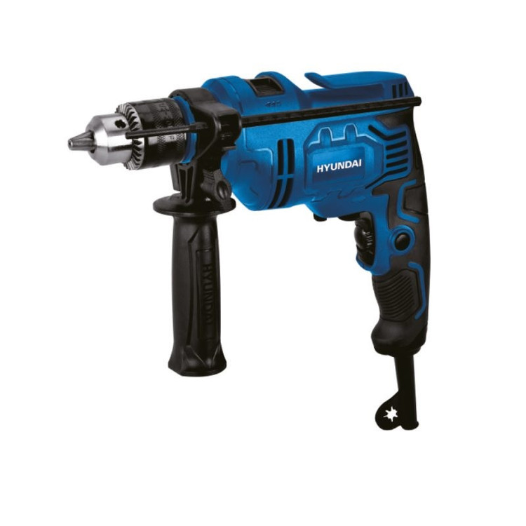 دریل برقی 710 وات 13 میلیمتری هیوندای مدل HP-7550 دارای موتور قدرتمند با توان 710 و سرعت بی باری آن 2800 دور بر دقیقه است. سایز سه نظام آن 13 میلیمتر و نوع آن آچاری است؛ که به کمک آن می توانیم در اندازه ها و قطر های دلخواه، کار سوراخکاری را انجام دهیم. دریل فوق دارای موتور پرقدرت مس است که در توان این دستگاه موثر و زسانایی خوبی را به وجود میآورد. باتوجه به سیم پیچ نمام مس آن قدرت تحمل حرارت بسیار بالا را دارد که از آن برای ایجاد رسانایی بالا و به وجود آمدن میدان مغناطیسی قوی استفاده می شود.یک مزیت بسیار مهم این دستگاه برخوردای از کلید های ضدغبار و بلبرینگها و کلید کلید پاور است که دستگاه را در برابر ذرات معلقی که براثر دریل کاری به وجود میآید محافظت میکند مه خود سبب طول عمر دستگاه میشود. این دستگاه دارای دیمر است که امکان تنظیم ولتاژ و در نتیجه آن امکان کنترل سرعت دستگاه را ایجاد می کند. و همچنین دارای دکمه دیمر است و رنگ آن قرمز و روی کلید روشن و خاموش به صورت گردان می باشد. یکی از ویژگی هایی که مورد توجه مصرفکنندگان قرار میگیره این است که با استفاده از این دریل روی چوب سوراخ تا عمق 25 میلیمتر و روی بتن و فلز سوراخ تا عمق 10 میلیمتر میتوان ایجاد کرد.سیستم تغییر جهت و قفل سوئیچی که روی دریل فوق تعبیه شده به این منظور است که در زمان هایی که دریل گیر میکند میتوان با فشردن دکمه تغییر جهت و چرخش معکوس دریل را از داخل سوراخ بیرون بکشیم. قفل سوئیچی که روی آن قرارگرفته به منزله این است که در مدت زمان زیادی بدون فشار دادن کلید سرعت، از دریل استفاده کند.