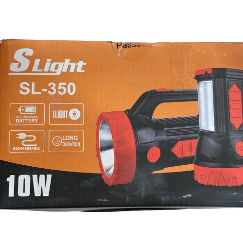 نور افکن شارژی اس لایت مدل SL-350 ساخت کشور چین مجهز به باتری شارژی با قدرت شارژدهی تا 8 ساعت امکان نور دهی در دو حالت زیاد و کم به همراه چراغ فانوسی دارای دریچه انعکاس نور ویژه برای بالا بردن پرتاب نور