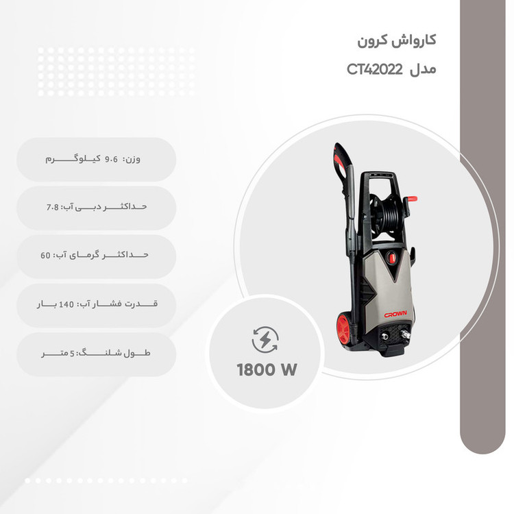کارواش کرون 140 بار مدل CT42022 مناسب برای استفاده خانگی، عمومی و صنعتی است. این کارواش از فشار آب خروجی 140 بار و موتور 1800 وات برخوردار است که به کاربر این امکان را میدهد تا سطوح و اجسام مختلف را با مواد شوینده در زمان کوتاهی به راحتی تمیز کند. این کارواش دارای وزن 9.6 کیلوگرم، دبی 7.8 لیتر در دقیقه و حداکثر دمای ورودی آب 60 درجه سانتیگراد است.